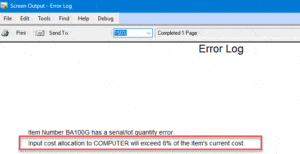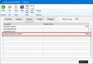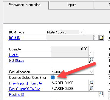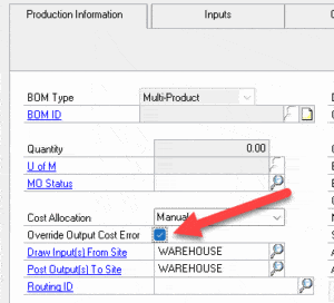 * NEW: Output Item Cost Variance Check. A new Numeric Option has been added to the Sytem and MO Doc Type Setups called “Allowable Output Cost Variance”. This is a percentage of an item’s Current Cost, and applies only to Actual Cost items. The MO must have only one Output Item Number. If Allowable Output Cost Variance is 8% and the total of Input Costs when applied to the Output is more/less than 8% of the item’s Current Cost it will prevent posting and add an error to the Error Log. This check can then be overriden using a new checkbox in the Production Information tab called “Override Output Cost Error”.