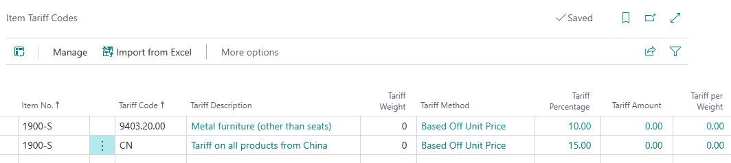 The Detailed Scope of the Tariff Module calculates sales line tariffs by looking for the Tariff Codes assigned to each item. An item can be assigned to more than one Tariff Code.