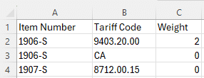 IMPORT FROM EXCEL – Item Tariff codes can be imported into Business Central from an Excel file. The required layout is shown below. The import will begin on row 2.