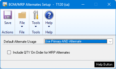 Include QTY On Order for MRP Alternates: by default the Use Up logic will only include Available Inventory (On Hand – Allocations). You can also include Quantity On Order, however the due date of the PO is not taken into consideration. The Quantity On Order is added into the Quantity On Hand.