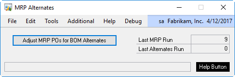 The MRP Alternates enhancement adjusts MRP’s Suggested PO’s if there is quantity available of USE UP Items.  The utility will run automatically if MRP is run from inside GP, but if MRP is run via a SQL Job you will need to manually run the MRP Alternates utility after MRP runs.