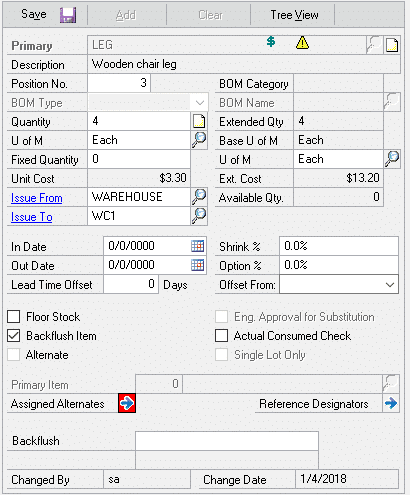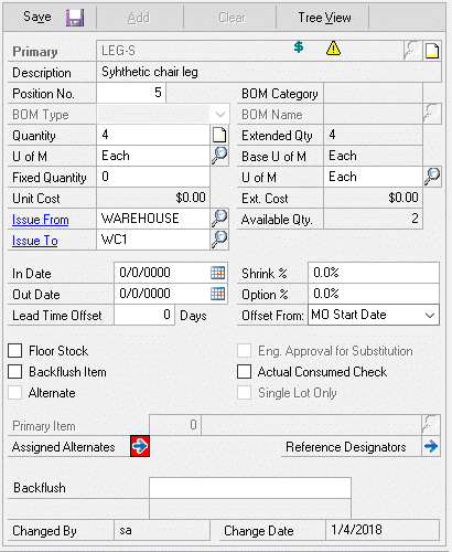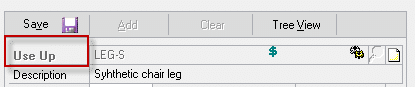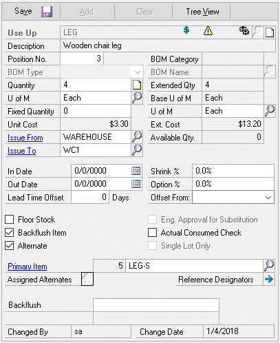 Setup for a Primary-Use Up relationship is shown above. LEG-S (Synthetic Leg) is replacing LEG (Wood Leg), however LEG should be used until it is gone from inventory. NOTE: the “Use Up” item and the “Primary” item must be equivalent in quantity and Unit of Measure. For example, both items are types of “leg” used on a chair, and both are used 4 per chair. The software will swap quantities as needed to use up the old item. Staying with the chair example, this could result in a chair that has three wood legs and one synthetic leg.