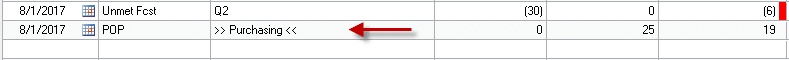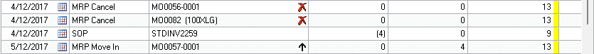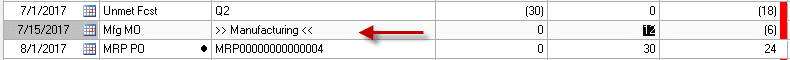 INV SS = Safety Stock IV Trx = Inventory Transaction or Transfer Mfg MO = Manufacturing Order Mfg PL = Manufacturing Picklist MRP Cancel = MRP Suggested Cancel MRP Move In = MRP Suggested Move In MRP Move Out = MRP Suggested Move Out MRP MO = MRP suggested MO MRP PL = MRP MO Picklist MRP PO = MRP suggested PO POP = Purchase Order SOP = Sales Transaction SVC = Service Call or Work Order parts requirement SVC Trf = Intransit Transfer Unmet Fcst = Manufacturing Unmet Sales Forecast As shown below, the MRP lines will have a Black Dot to highlight that they are from MRP and represent Planned supply or demand vs. actual. |