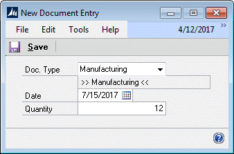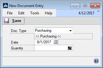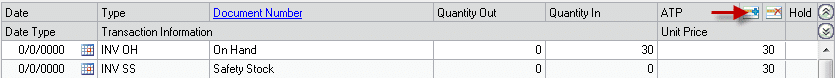 Enter a Date and Quantity. PowerATP functions in the Item’s Base Unit of Measure. NOTE: if the cursor is in an existing line in the ATP window, the New Document Entry window will pull in the Date and Quantity from that line as default values.