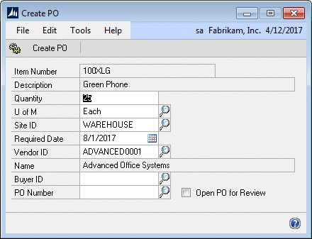 NOTE: GP Manufacturing must be installed to use the Create PO functionality.
