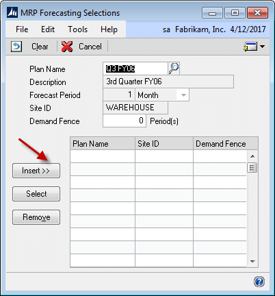 Click the INSERT button to add the forecast to MRP Forecasting Selections.
